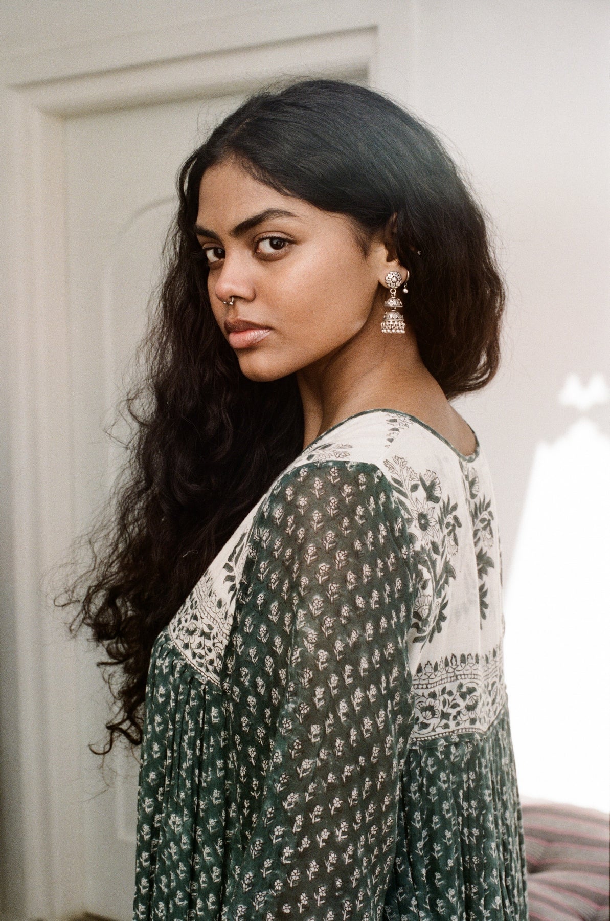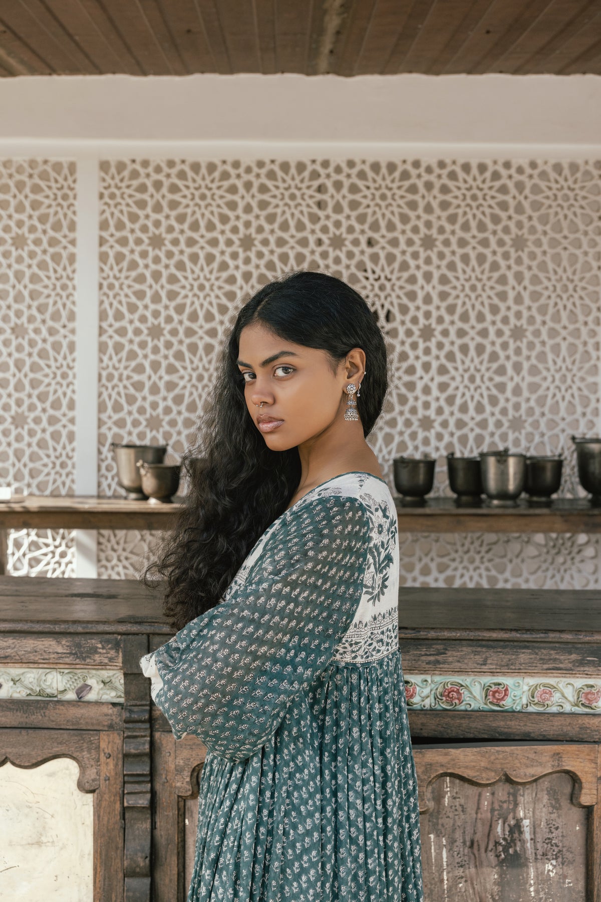 The Rooh Maxi Dress in Pine truly romanticises the magic inherent in hand block printed fabric. This captivating floor length style neatly finished with a bottom tier ensures a perfectly flowing feminine silhouette in gorgeous colours of pine green on a cream base. Featuring delicately extravagant blouson sleeves with an elasticated cuff, a sweet front tie, and midi length cotton underlining.