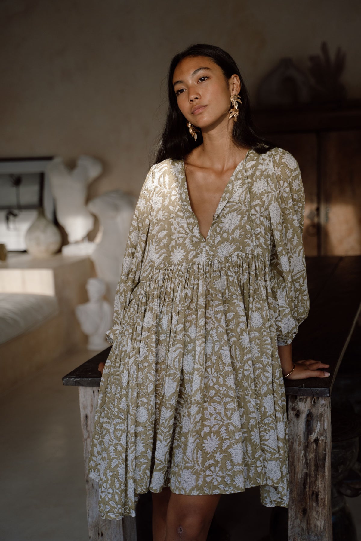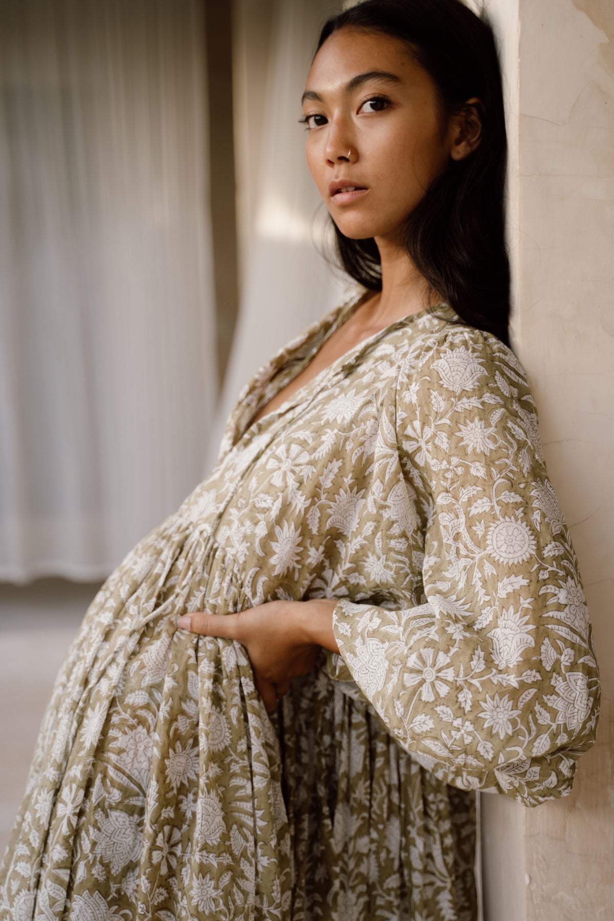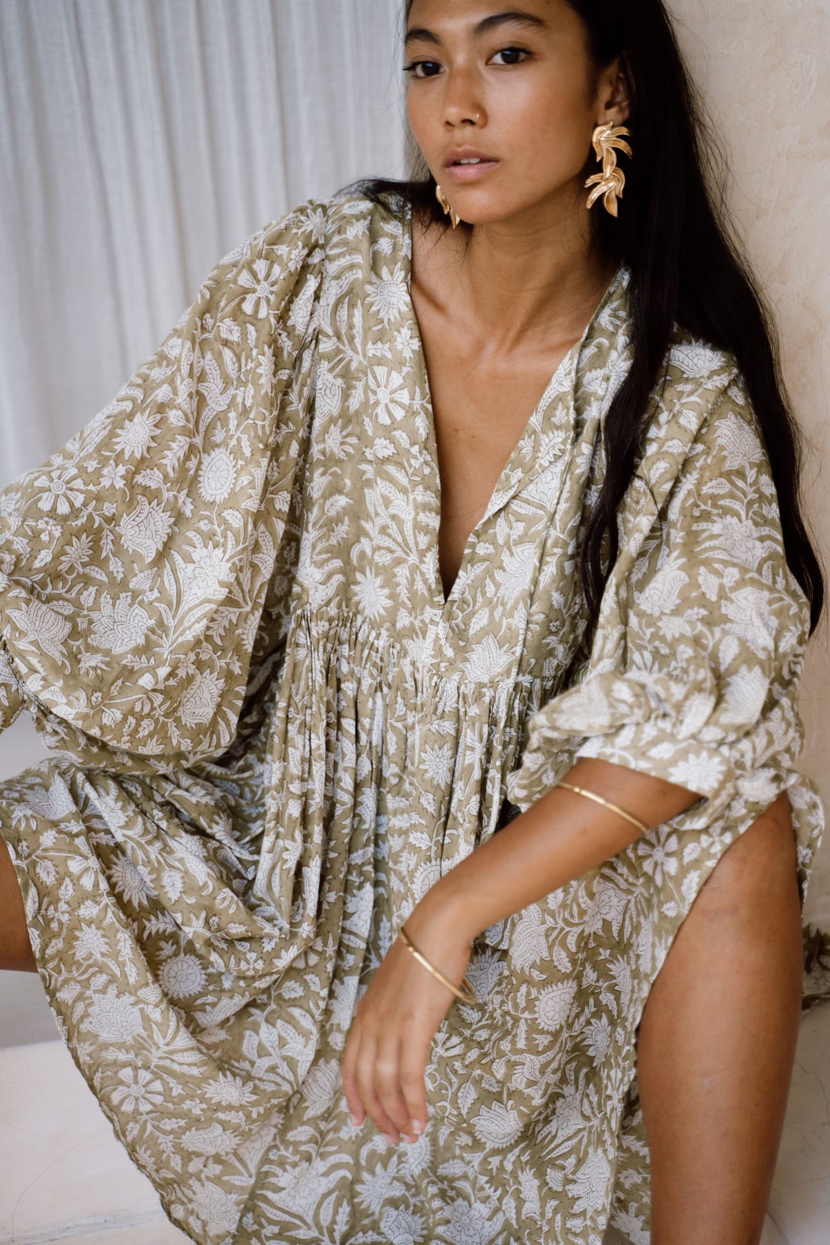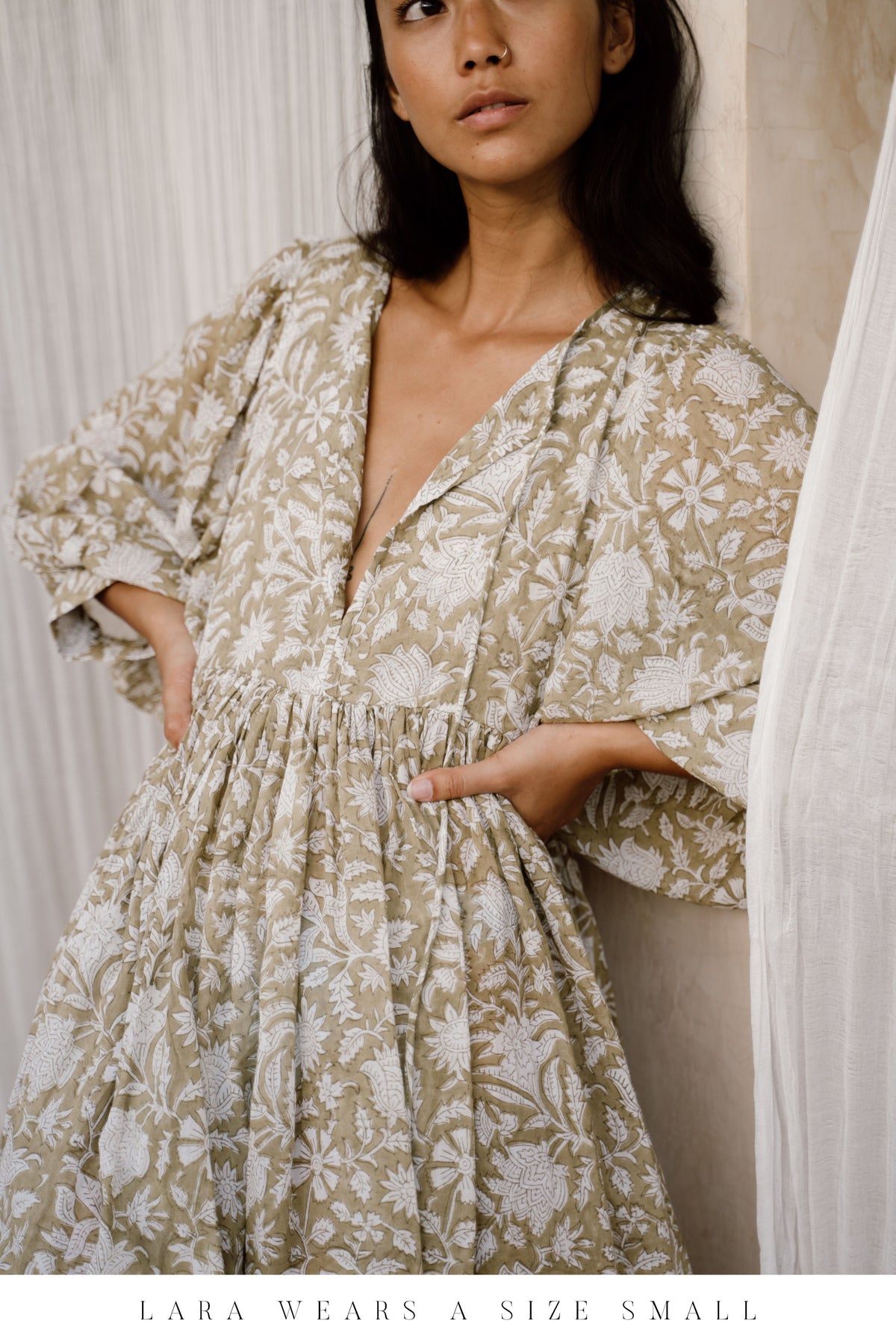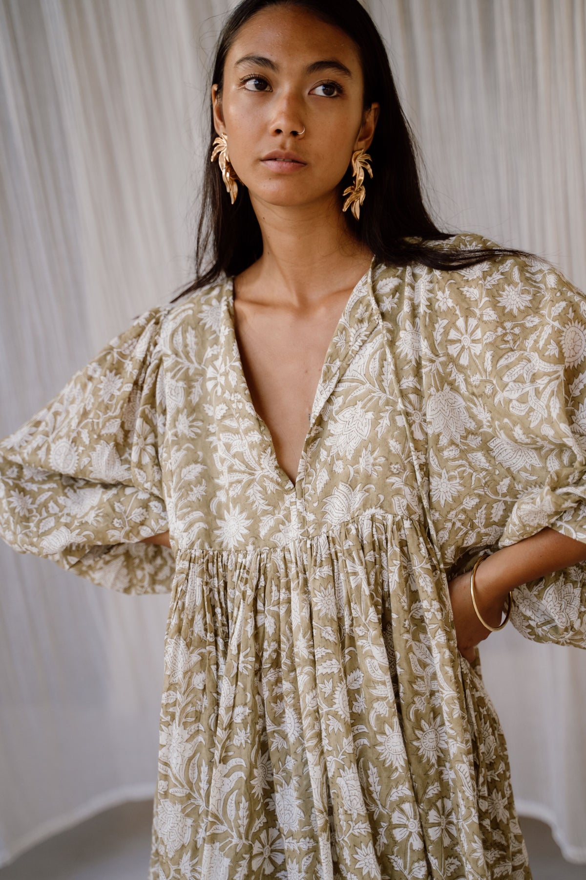 The Kyra design is made from two intricately hand-carved wood blocks, carefully placed one after the other onto the finest quality cotton voile, creating a dreamy hand block printed pattern inspired by the lotus flower in a gorgeous pale Olive green colour-way.