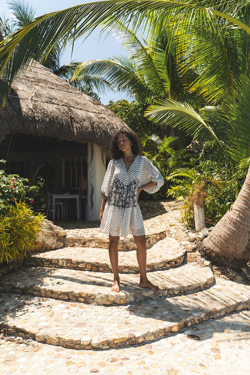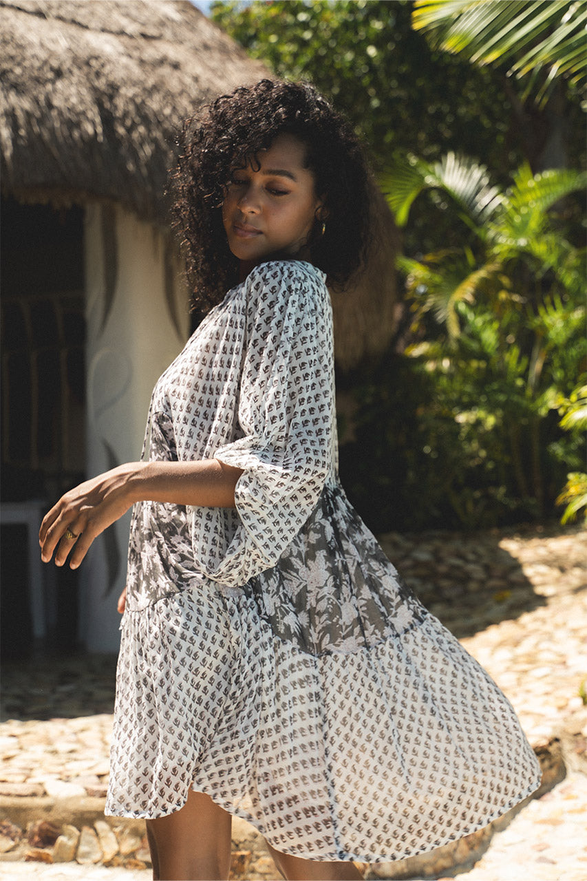 Celebrating our slow fashion ethos, Nora is an ode to the art of handmade. Beginning with four wood blocks intricately hand-carved to create two traditional floral designs, skilled artisans then use the blocks to slowly and carefully hand print delicate noir hues with a cacao outline upon the softest cotton voile. Tiers of printed fabric have then been gracefully layered and finished with mother-of-pearl buttons from bodice to base, forming this free flowing feminine style lovingly hand-crafted by a small group of women in Jaipur, India.