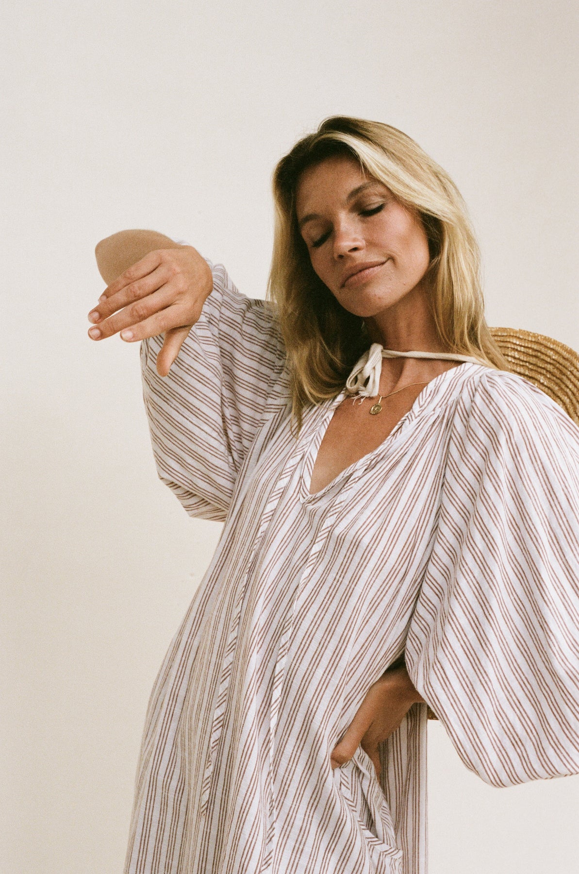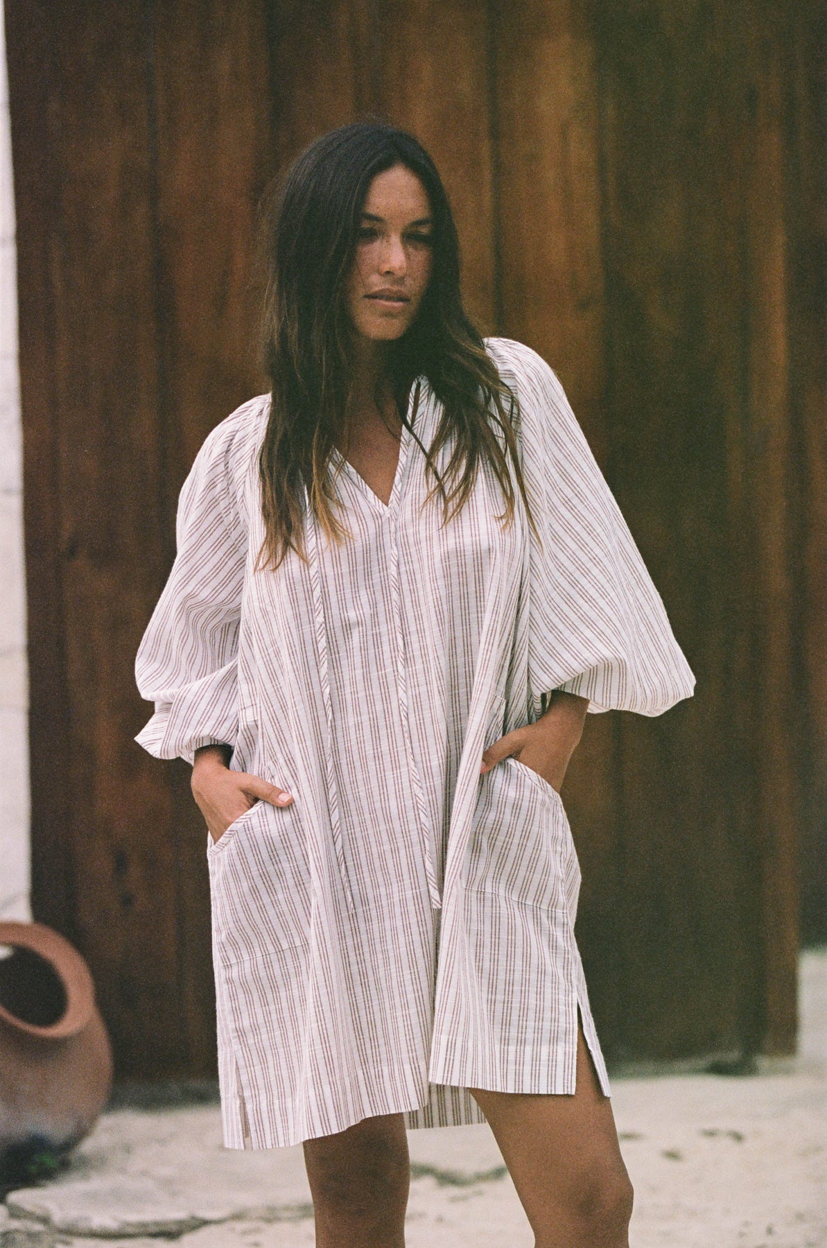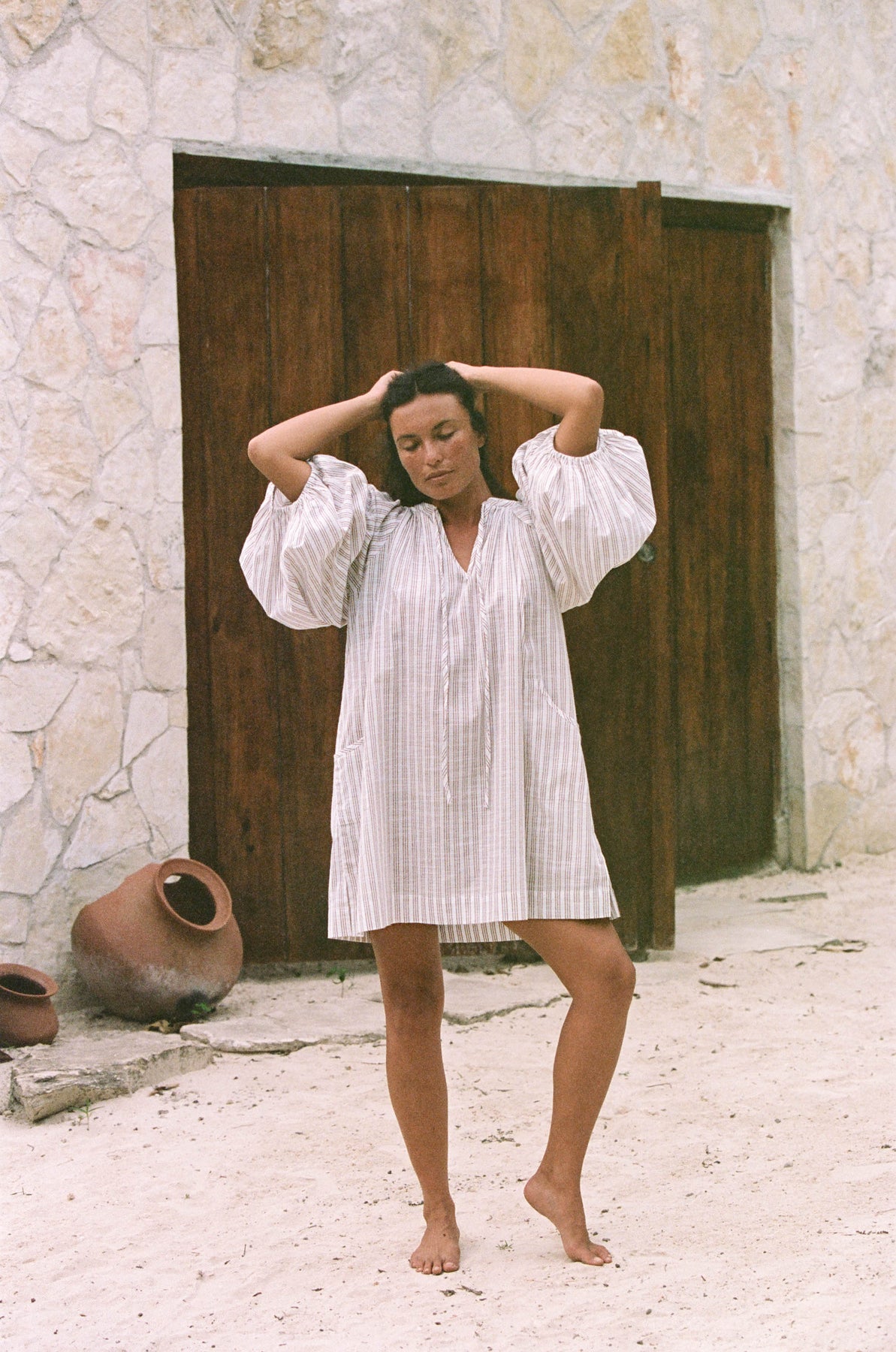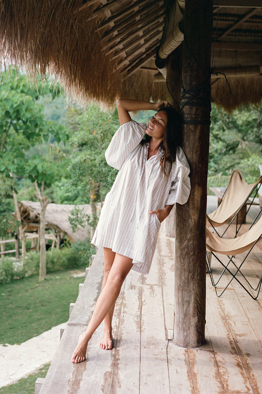 Inspired by a vintage silhouette and crafted with handloom fabric ~ a rare and exclusive sustainably handmade textile in modern times. This intentionally oversized mini dress  features a soft white colour-way contrasted with tan pinstripe detailing, while the shape offers a poet-style collar with optional front tie, romantic billowy sleeves finished with soft elasticated cuffs, and pockets at the hip.