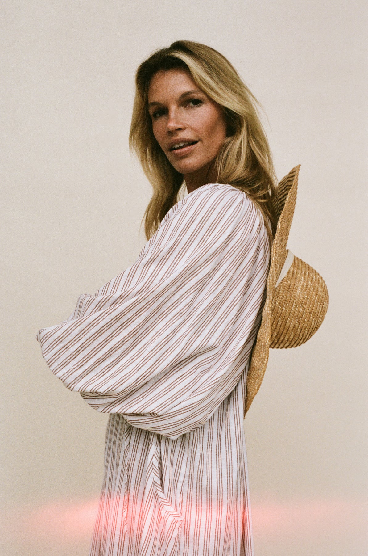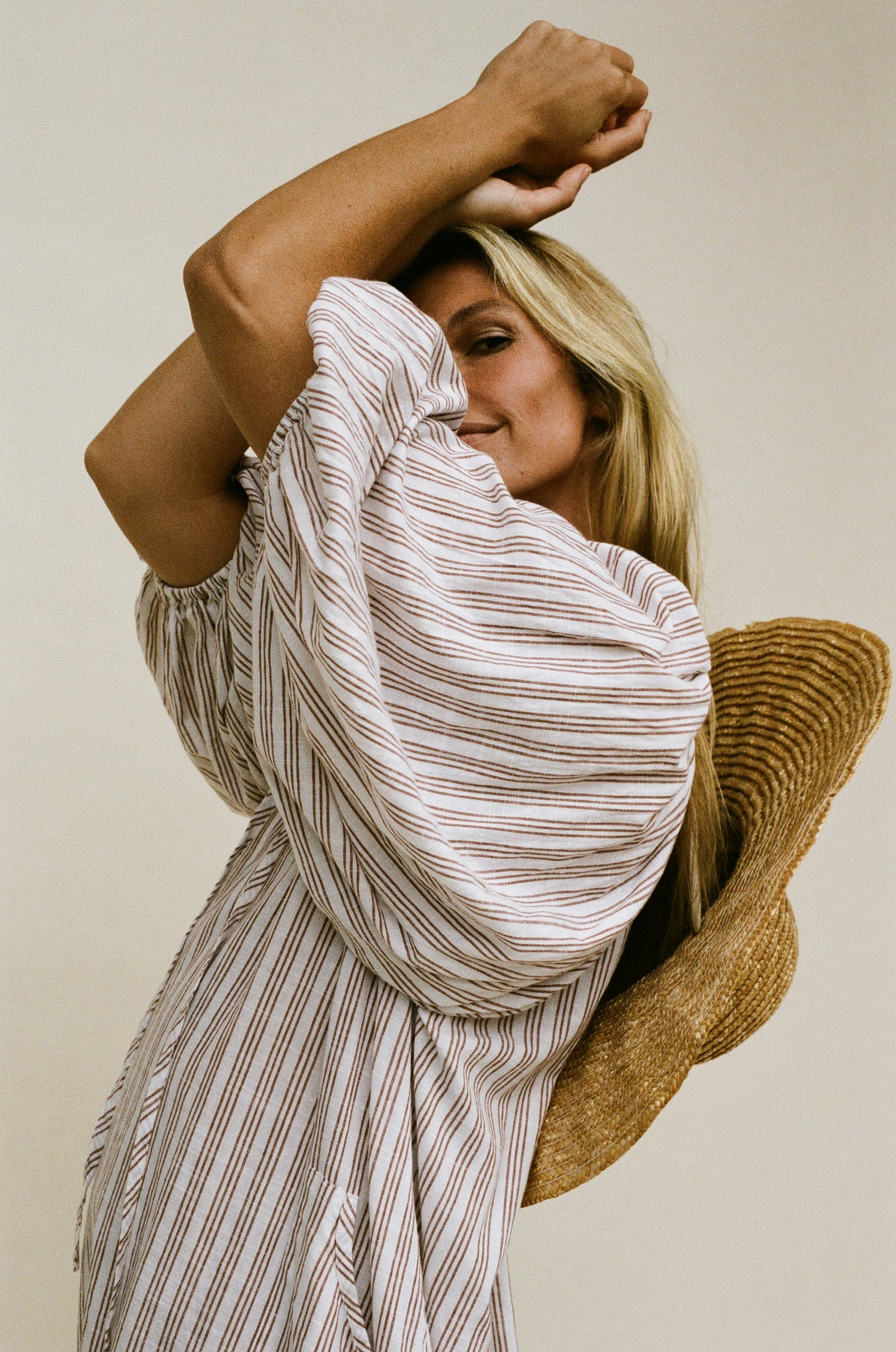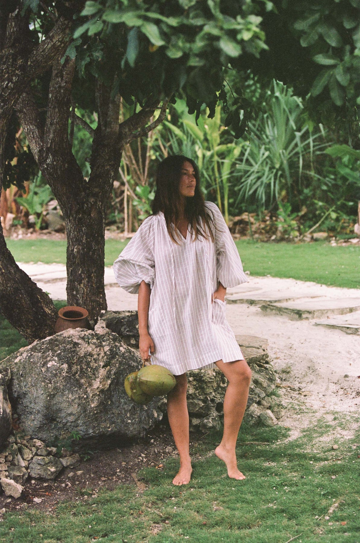 Inspired by a vintage silhouette and crafted with handloom fabric ~ a rare and exclusive sustainably handmade textile in modern times. This intentionally oversized mini dress  features a soft white colour-way contrasted with tan pinstripe detailing, while the shape offers a poet-style collar with optional front tie, romantic billowy sleeves finished with soft elasticated cuffs, and pockets at the hip.