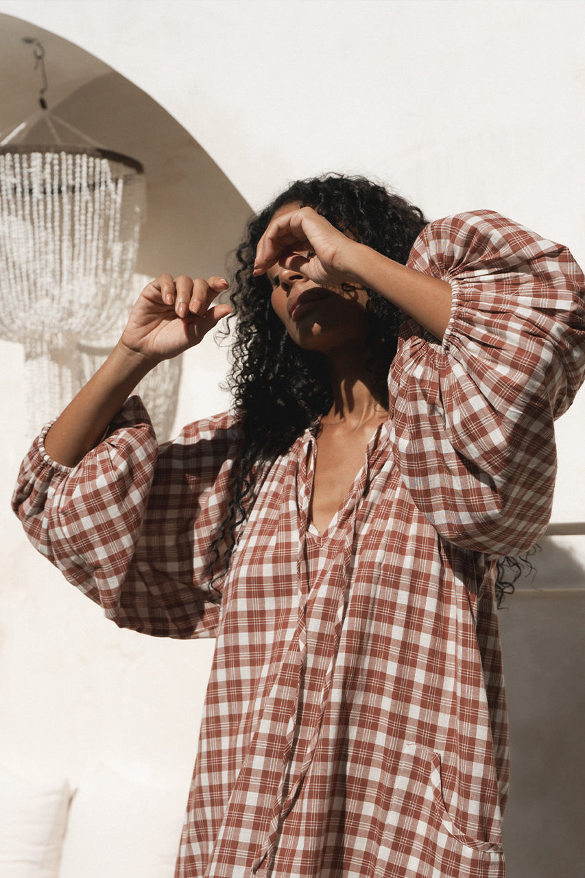 Offering a warm red clay colour-way contrasted with classic off-white tones, this intentionally oversized mini length design features a poet-style collar with optional tie, romantic billowy sleeves finished with soft elasticated cuffs and pockets at the hip.